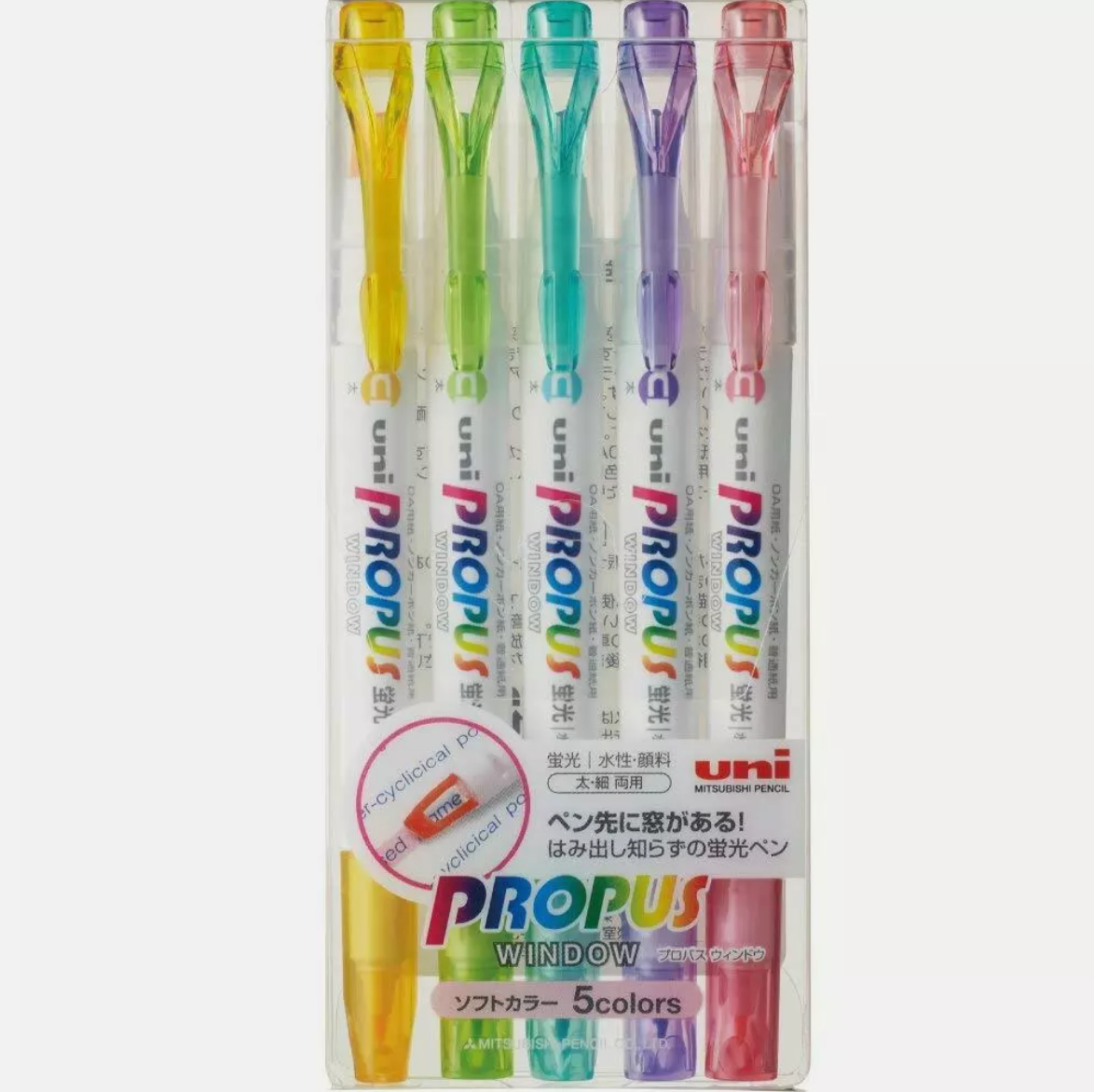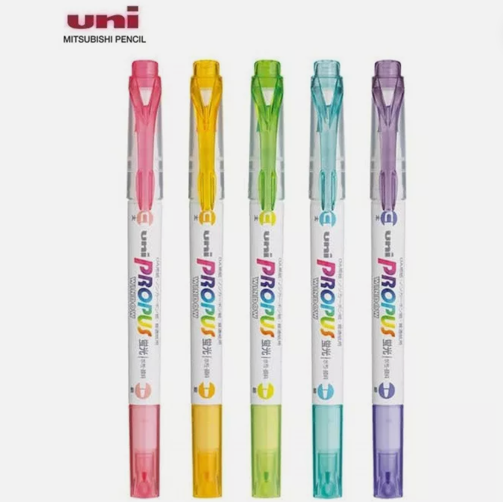 uni日本三菱双头荧光笔 透明视窗粗细双头 彩色标记记号笔 白杆5色装